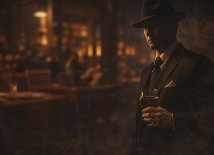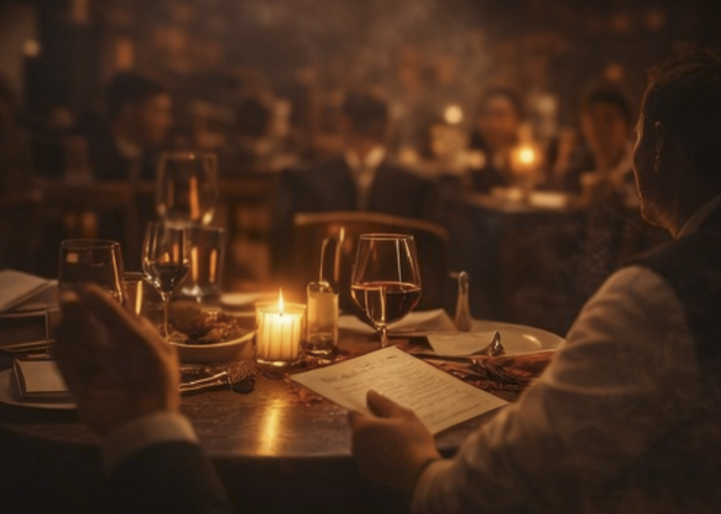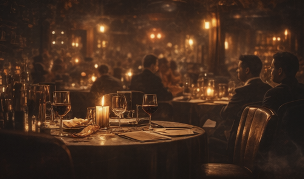 • Dim lit tables, moody lighting, and suspenseful ambiance